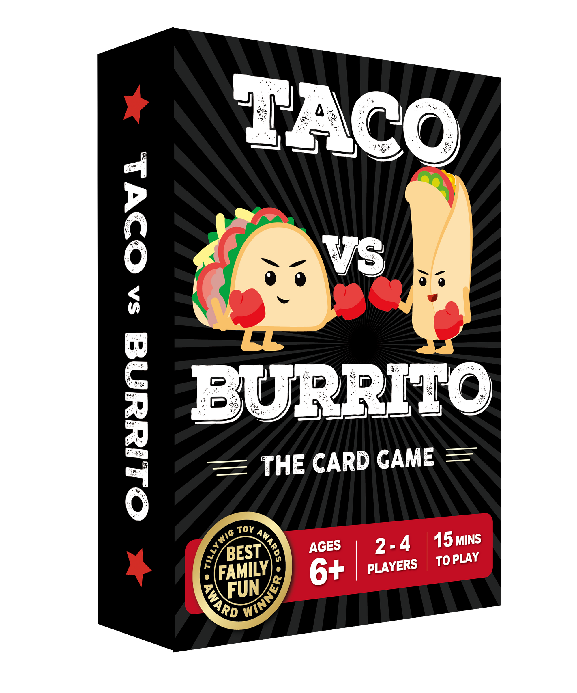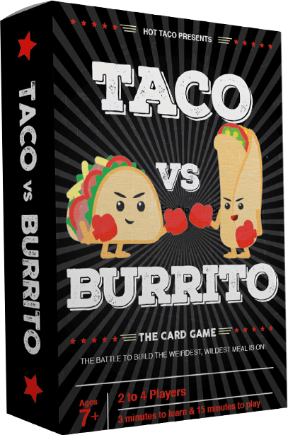Taco vs Burrito is surprisingly strategic, gripping, wacky-fun and exciting to the very last card. And when it’s all over, no matter who wins… EVERYONE WILL WANT TO PLAY AGAIN! YIPPEE!