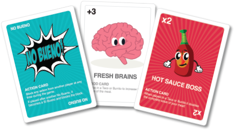 Action Cards are truly SPICY and can change the outcome of the whole game! Be sure to keep those No Bueno Cards handy for when you want to win this food fight!